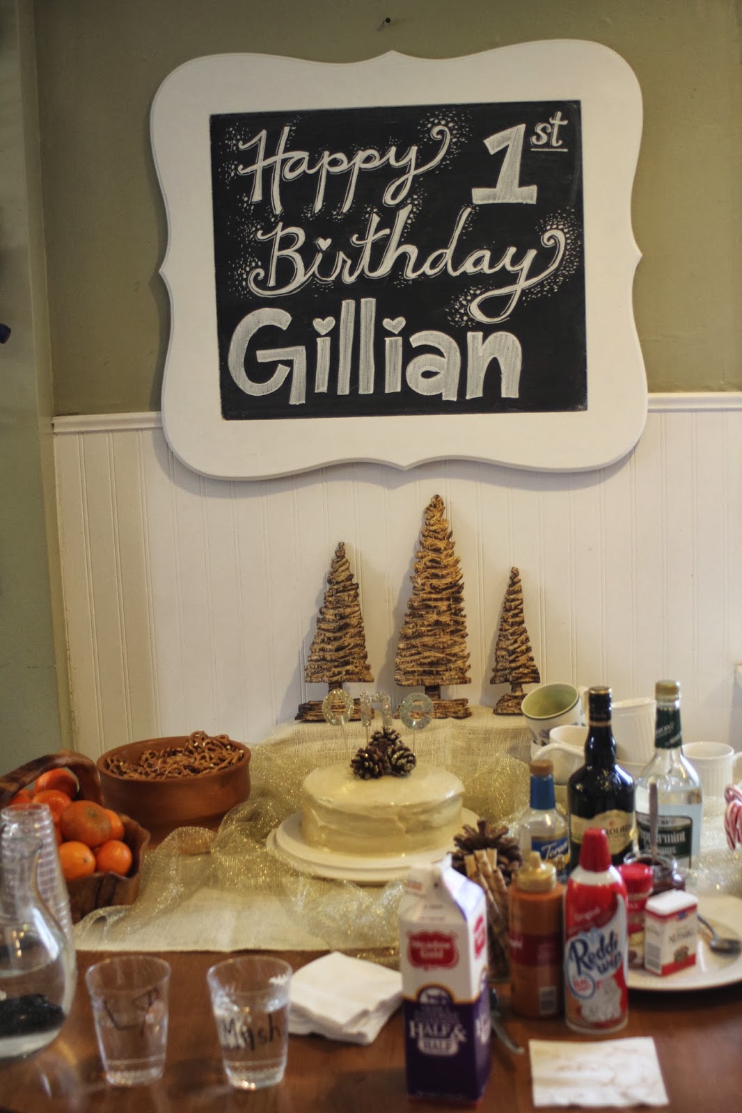 Of course, a party for a one-year-old is primarily for the parents. For Gillian's birthday party, we invited all of our friends and threw a party with a winter theme. With that in mind, everything was rustic and gold. I kept things simple with a boozy hot cocoa bar and s'mores in the back yard.
